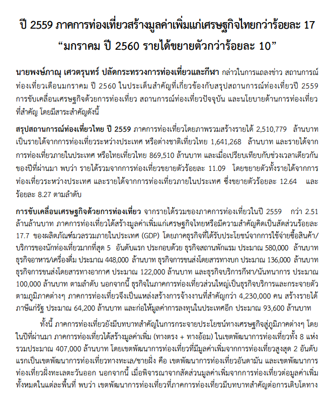 มกราคม ปี 2560 รายได้จากการท่องเที่ยวขยายตัว กว่า ร้อยละ 10