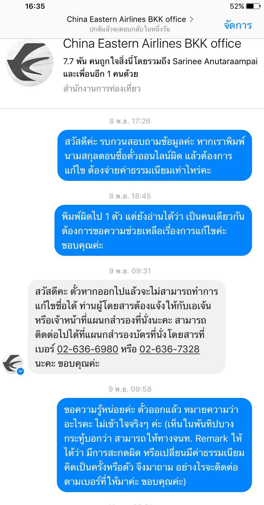 ผู้โดยสารที่จองตั๋วของสายการบินไชน่าอีสเทิร์น แอร์ไลน์ ไม่ว่าจะจองผ่านเอเจ้นท์ หรือแอร์ไลน์ แล้วพิมพ์ผิด สามารถแก้ไขการสะกด ชื่อ - สกุล ได้ ถ้าที่ไทยไม่ทำให้ ติดต่อไปที่จีนเลยค่ะ ให้คนที่พอรู้ภาษาจีนช่วย เสียค่าธรรมเนียมการเปลี่ยน 100 หยวน อันนี้ไม่แน่ใจว่า 100 หยวนต่อครั้ง หรือต่อตัว แล้วก็ได้กี่ครั้งนะคะ (แต่ถ้าที่ไทยทำให้ ฟรี ค่ะ)