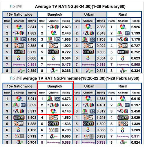 น่าสนใจไม่น้อยสำหรับตัวเลขเรตติ้งจากการสำรวจของ “เอซีเนลสัน” ในช่วงระหว่างวันที่ 1 - 28 กุมภาพันธ์ ที่ผ่านมา โดยแยกเป็นช่วงเวลาตั้งแต่เวลา 6.00 - 24.00 น. และช่วงเวลาไพรม์ไทม์ 18.20 - 22.20 น.