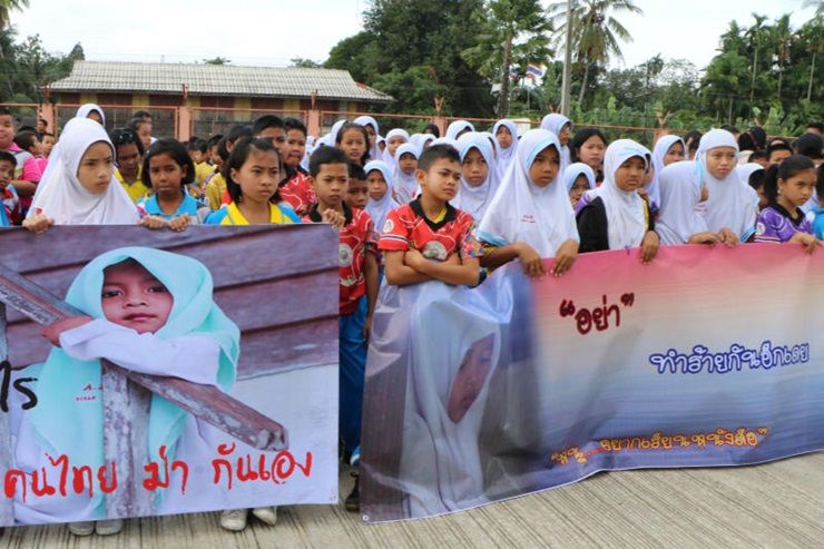 บรรยายภาพ- ต้านความรุนแรง :ประชาชนชาวนราธิวาส เดินขบวนรณรงค์ต่อต้านความรุนแรง และประณามการกระทำของกลุ่มคนร้ายก่อความไม่สงบในพื้นที่สามจังหวัดชายแดนใต้ ที่ลงมือก่อเหตุระดมยิงใส่รถกระบะทำให้มีผู้เสียชีวิต 4 ศพในพื้นที่ อ.รือเสาะ ซึ่งมีเด็ก 2 ราย และผู้หญิง 1 รายต้องเสียชีวิตด้วย เหตุเกิดเมื่อวันที่ 2 มี.ค.ที่ผ่านมา- ภาพ : แวดาโอ๊ะ หะไร
