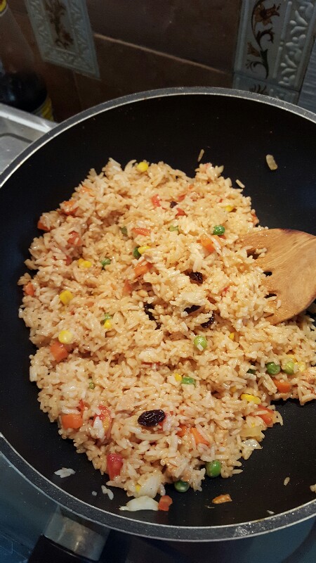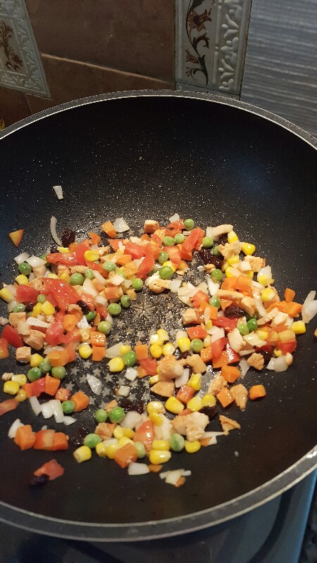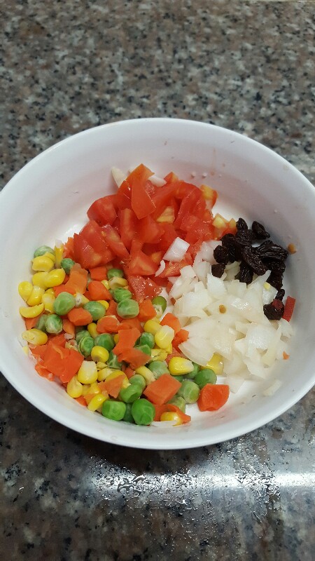 ใส่เนยเค็มลงไป และหอมหัวใหญ่ลงผัด แล้วตามด้วยมะเขือเทศ ผักสามสี ลูกเกด ผัดให้เข้ากัน
