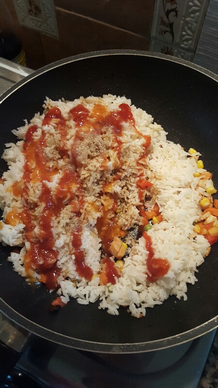 ใส่ข้าวสวยลงไปผัด แล้วใส่ซอสมะเขือเทศ เครื่องปรุงรสตามชอบ