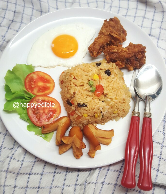 ตักข้าวโดยใช้ถ้วย กดข้าว แล้วเอาไข่ดาว ไก่ทอด จัดใส่จาน เคียงผักให้สวยงาม ทานกับซอสมะเขือเทศ