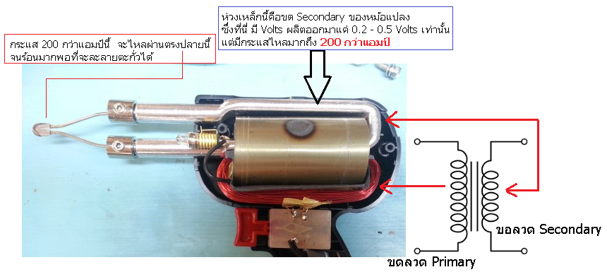 ด้าน secondary มา "ลัดวงจร" ทำให้ลวดเส้นใหญ่นั้นร้อนจนจี้ตะกั่วละลายได้
