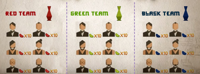 แต่ละทีมประกอบด้วย 6 คน และโถประจำทีม แต่ละคนจะได้ถั่วคนละ 10 เม็ด ดังภาพ