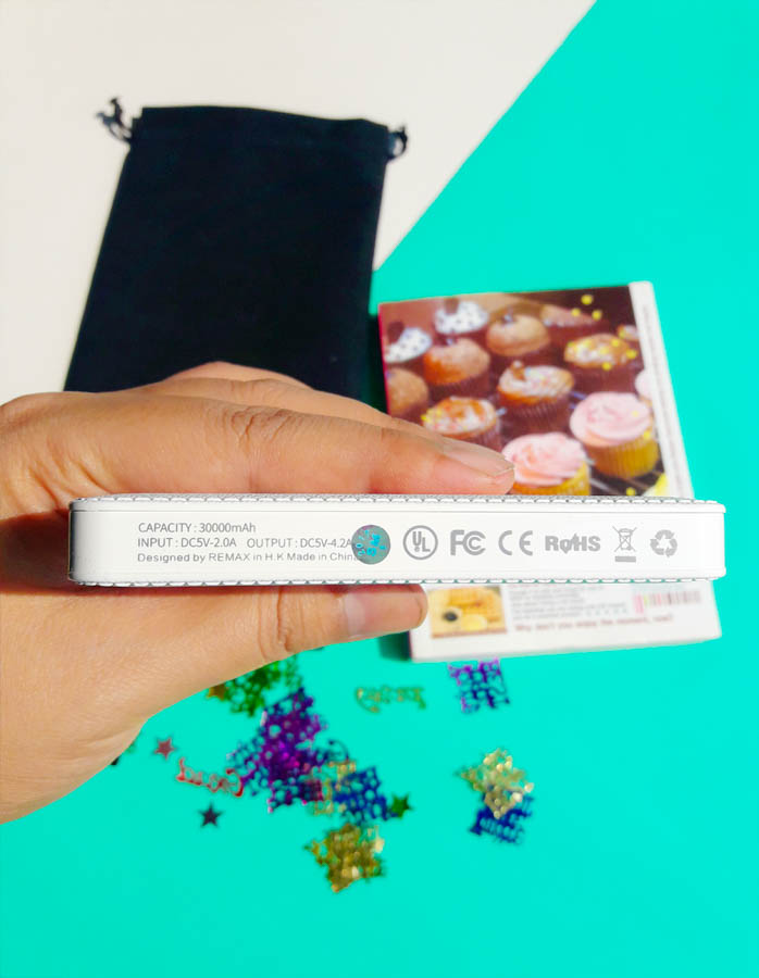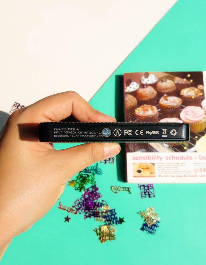 ด้านยาวจะมีโลโก้ของแบรนด์ ความยาวของตัวแบตสำรองถือว่ายาวพอสมควร หนา 1.5 เซนติเมตร