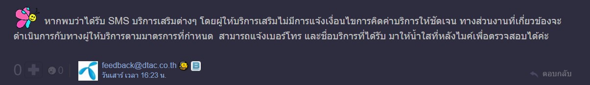มี sms เข้ามาเมื่อวาน เกี่ยวกับเนท ว่าใช้เนทเกิน 10 บาท บลาๆๆๆ แต่ข้อเท็จจริง เมื่อวาน ผมไม่ได้ต่อเน็ทเลย แจ้งเรื่องไปทางอีเมล์ของ cc ผ่านหน้าเว็บ dtac แต่ยังไม่มีการตอบกลับมา เลยมาแจ้งผ่านหน้าพั