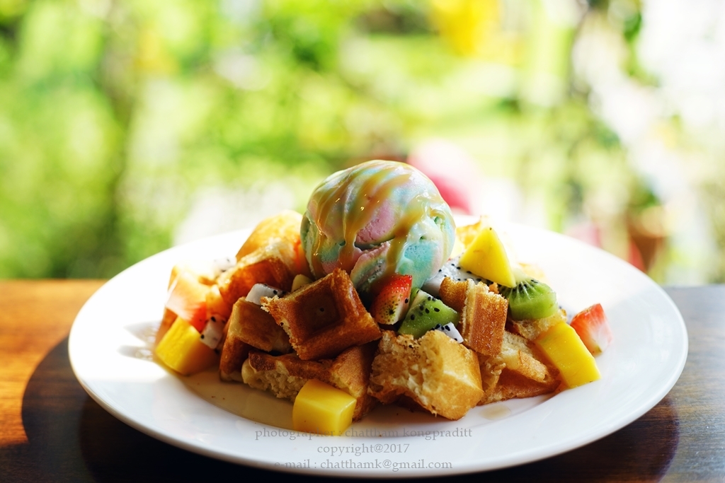 มีกาแฟแล้วต้องตามด้วยขนมครับ เราสั่ง Waffle Fancy ครับ เป็น Waffle ตัดเป็นชิ้นๆพอคำ คลุกมากับผลไม้สด มี กีวี มะม่วง สตรอเบอรี่ แก้วมังกร โปะด้วยไอศกรีม 1 ลูกครับ คนที่ไปด้วยเลือก ไอศกรีมเรนโบว์ เจ้าตัวเรียกไอติม Paddle Pop รสชาติก็ตามนั้นเลยครับ Waffle กับผลไม้สด ชอบทานอยู่แล้วครับ ^^