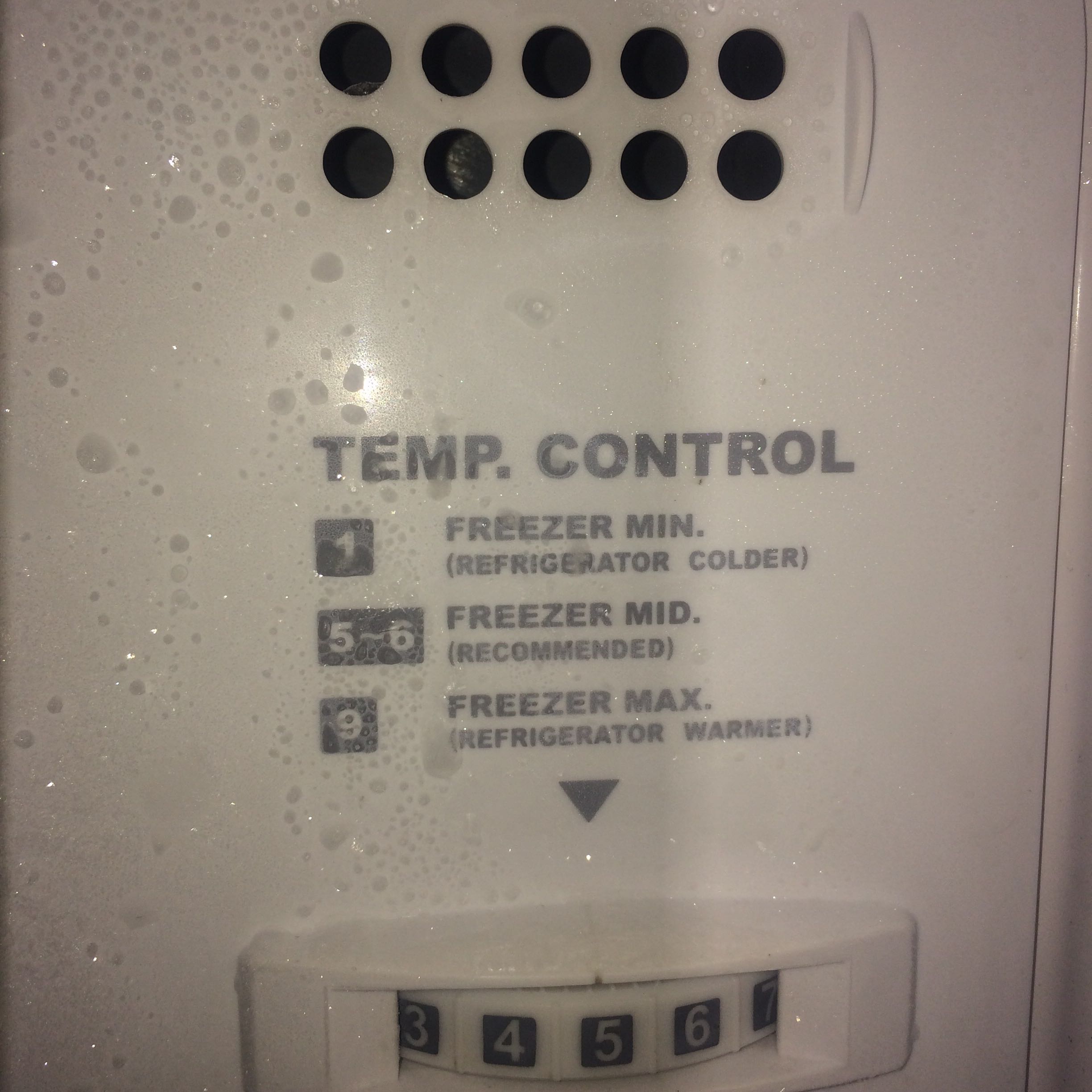 ชั้นบนไม่มีปัญหาอะไรแต่ชั้นล่างนี่สิมีน้ำแข็งเกาะเต็มทั้งๆที่ตั้งอุณหภูมิไว้ที่ หมายเลข 1 แบบในภาพตู้เย็นผมก็เสียบปลั๊กทิ้งไว้นานทีจะแช่อะไรจะหยิบจะแช่จะอะไรนานๆทีผมจะทำ