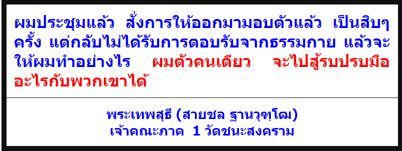 พระเทพสุธี หรือมหาสายชล ศิษย์เอกแห่ง " ไม้บรรทัดวงการคณะสงฆ์ " หรือ สมเด็จพระมหาธีราจารย์ ( นิยม ) วัดชนะสงคราม ตั้งแต่ได้รับการแต่งตั้งมาเหมือนกับว่าจะไม่ทำงาน เพราะหากทำงานตามหน้าที่ที่มี ลัทธิกบฏผีบุญนี้คงจะเกิดขึ้นไม่ได้ พอไปทวงถามถึงความรับผิดชอบ กลับตอบว่า ตัวผมตัวคนเดียวจะทำอะไรได้ ทั้งที่รับเงินเดือนอยู่ทุกเดือน แต่กลับไม่มีความรับผิดชอบเช่นนี้แล้วแบบนี้ยังจะปล่อยทิ้งเอาไว้อีกหรือ