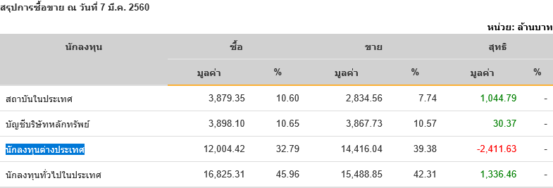 Sinthorn Summary 7/3/2560 : ต่างชาติขายสุทธิ -2,411.63 ลบ.