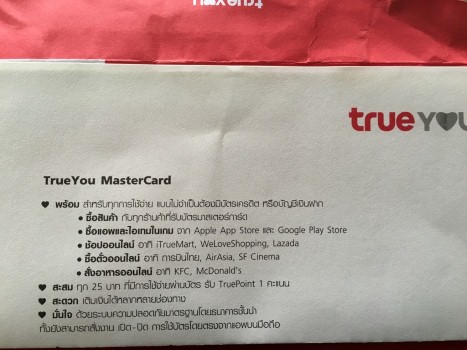 ได้บัตร TrueYou Master Card มาครับ ในรายละเอียดบอกว่า ทุกๆ การจ่ายเงินผ่านบัตรนี้ 25 บาทจะได้รับ True Point 1 คะแนน ผมเลยทดสอบจ่ายบิลเน็ต 3BB และ TOT ผ่านบัตรนี