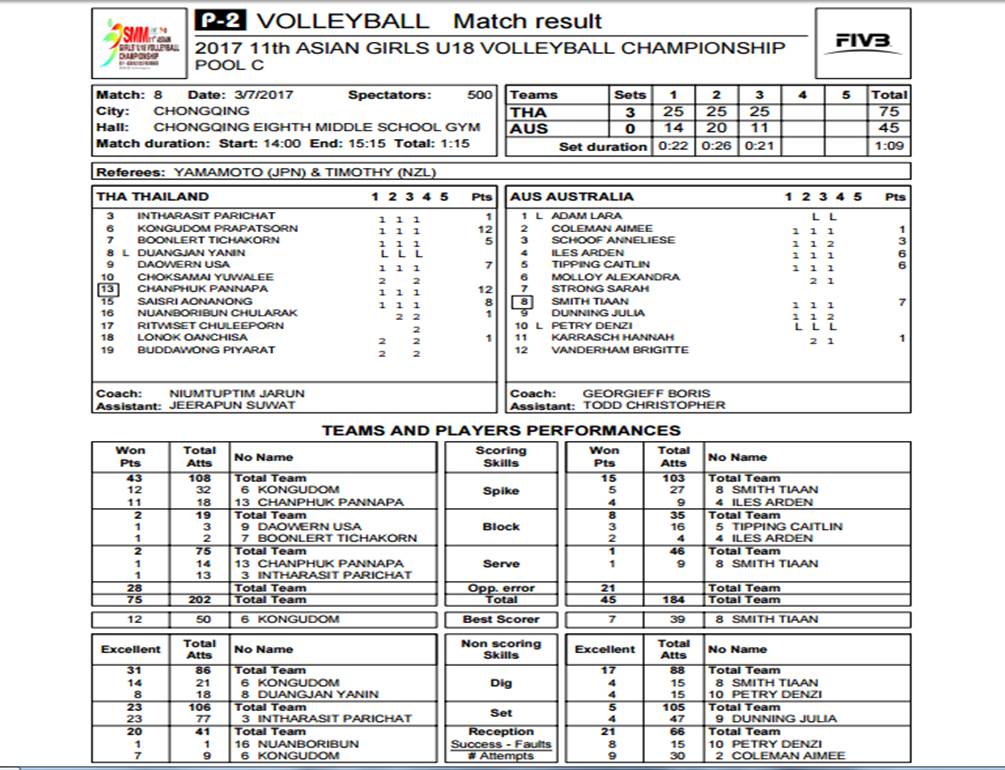 สถิติอย่างเป็นทางการ U18 THA-AUS