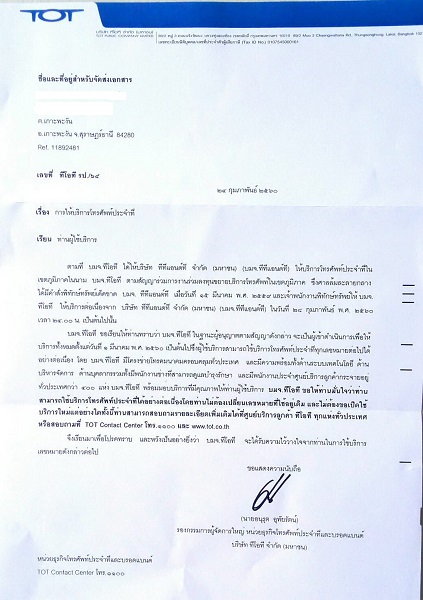 สองเดือนก่อน โทรศัพท์เสีย ใช้งานไม่ได้ ผมได้พยายามสอบถามทางทีโอทีมาโดยตลอด ซึ่ง ณ ตอนนี้ ได้รับหนังสือชี้แจงมาแบบนี้