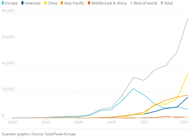 แรงกระตุ้นของรัฐบาลและความห่วงใยที่เพิ่มขึ้นเกี่ยวกับการเปลี่ยนแปลงสภาพภูมิอากาศช่วยให้เกิดการเติบโตอย่างแข็งแกร่งของพลังงานแสงอาทิตย์ ประเทศจีนเพียงประเทศเดียวคิดเป็นสัดส่วนเกือบครึ่งหนึ่งของการติดตั้งพลังงานแสงอาทิตย์เมื่อปีที่แล้ว ด้วยตลาดเอเชียโดยคิดเป็นสัดส่วนเกือบสองในสามของกำลังการผลิตในปี 2016