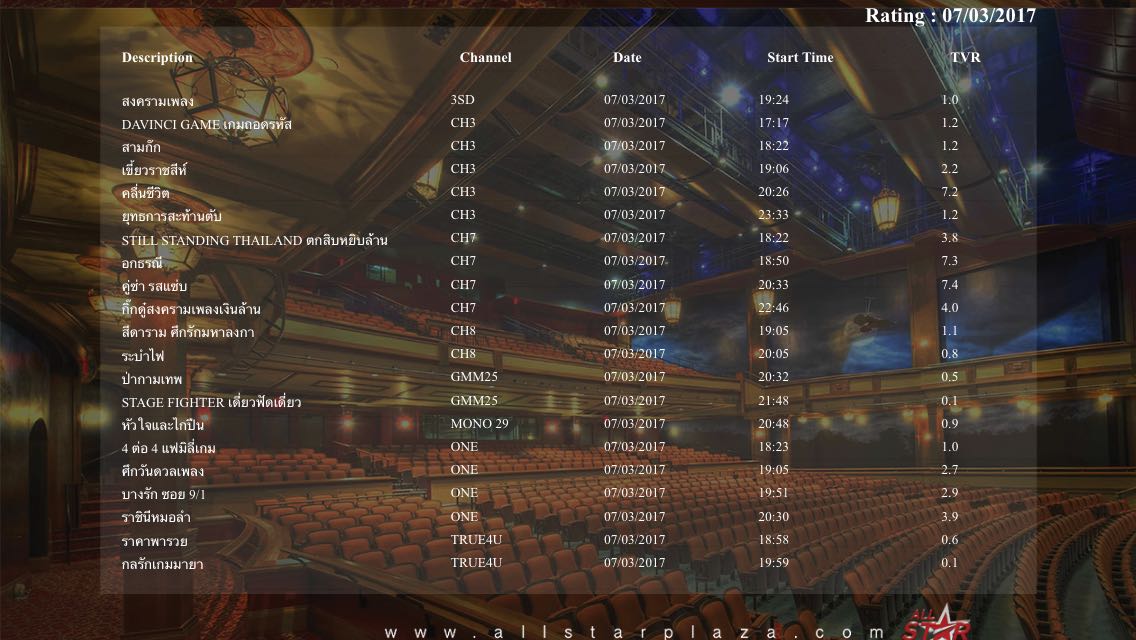 เรตติ้งวันจันทร์ที่ 20 มีนาคม พศ.2560 -------------------------------------------------------------- สงครามเพลง 3SD เรตติ้ง 0.6 เขี้ยวราชสีห์ CH3 เรตติ้ง 2.0 บ่วงหงส์ CH3 เรตติ้ง 3.2 อกธรณี CH7 เรตติ้
