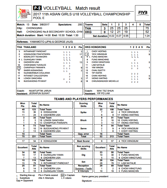 สถิติจากแมทช์เมื่อวานนะครับ เอาที่คะแนนเยอะสุดในแต่ละด้าน ที่มา http://www.asianvolleyball.org/upfile/bulletin/files/201407/217364060_1405528418.pdf ตบได้คะแนนสูงสุด: พิมพิชญา ก๊กรัมย์ 11 แต้ม, สองส