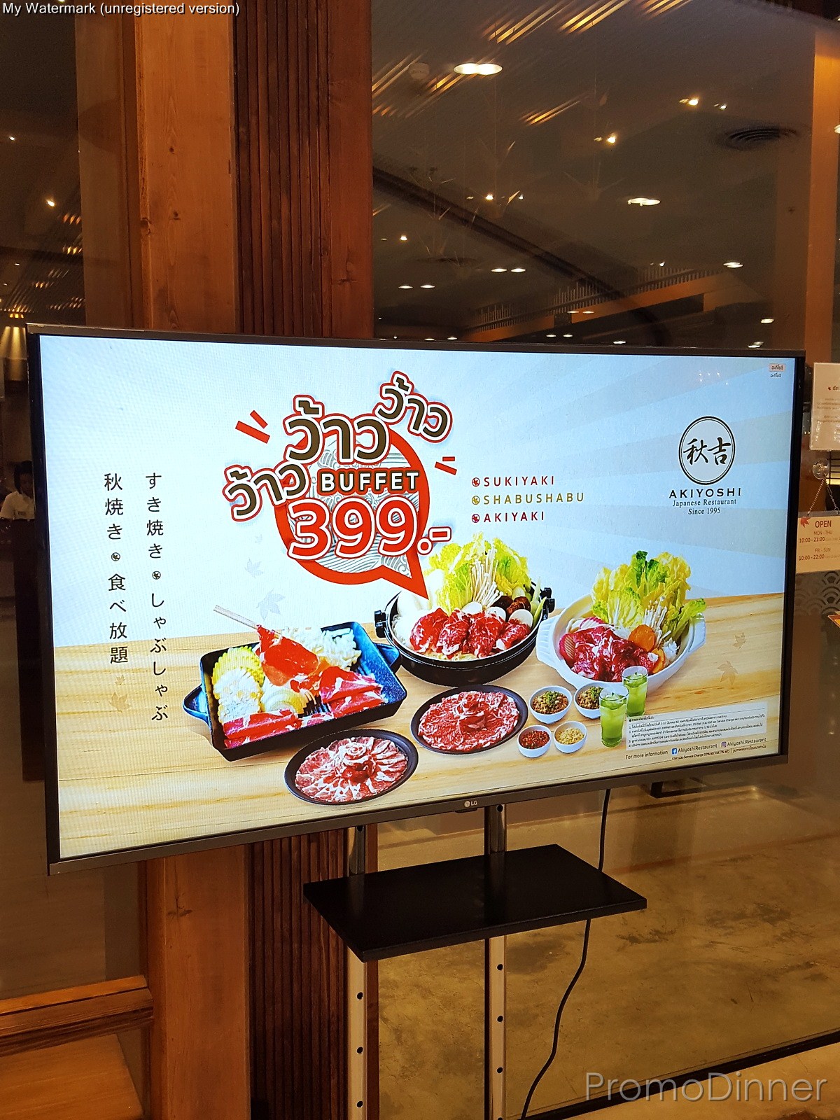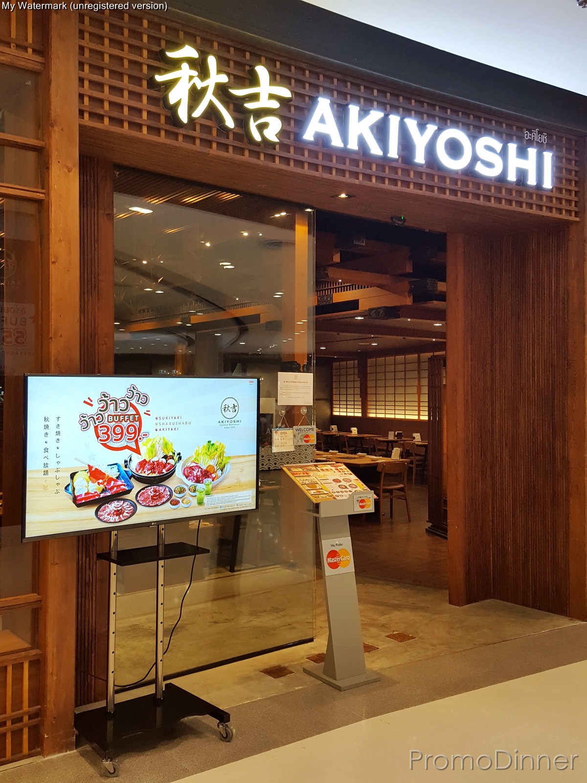 สวัสดีครับ เรื่องเกิดขึ้นเมื่ออาทิตย์ก่อน ตัวผมเองว่างๆเบื่อๆ ไม่รู้จะไปไหน พอดีนึกขึ้นได้ว่า มีที่นึงที่อยากจะลองไปเดินเล่นดู แต่ไม่มีโอกาสเสียที เพราะมันค่อนข้างไกลผมมาก มันคือ Central West Gate นั่นเองครับ พอวันนี้เบื่อๆพอดีเลยไปซะหน่อย ระหว่างที่เดินเล่นไปเรื่อยๆจนเหนื่อย (เพราะห้างใหญ่โตมากจริงๆ) ก็ไปสะดุดตากับป้ายโปรโมชั่นและรูปจากเสาและทีวีหน้าร้าน Akiyoshi โดยมี 2 อย่างที่ผุดขึ้นมาในหัวคือ 1. Akiyoshi มีปิ้งย่างด้วยหรอวะ?? 2. ราคา 399 นี่ได้ 2 อย่างเลย?? ถูกอย่างนั้นเลยหรอ?? (อันนี้ต้องออกตัวก่อนว่าส่วนตัวผมชื่นชอบร้าน Akiyoshi เป็นทุนเดิมอยู่แล้ว และได้ไปทานบ้างตามโอกาส แต่ปกติราคาจะอยู่ที่ 400-500 บาทขึ้นไปแล้วแต่ option) เลยลองเข้าไปพิสูจน์ดู จนเป็นที่มาของรีวิวฉบับนี้ครับ