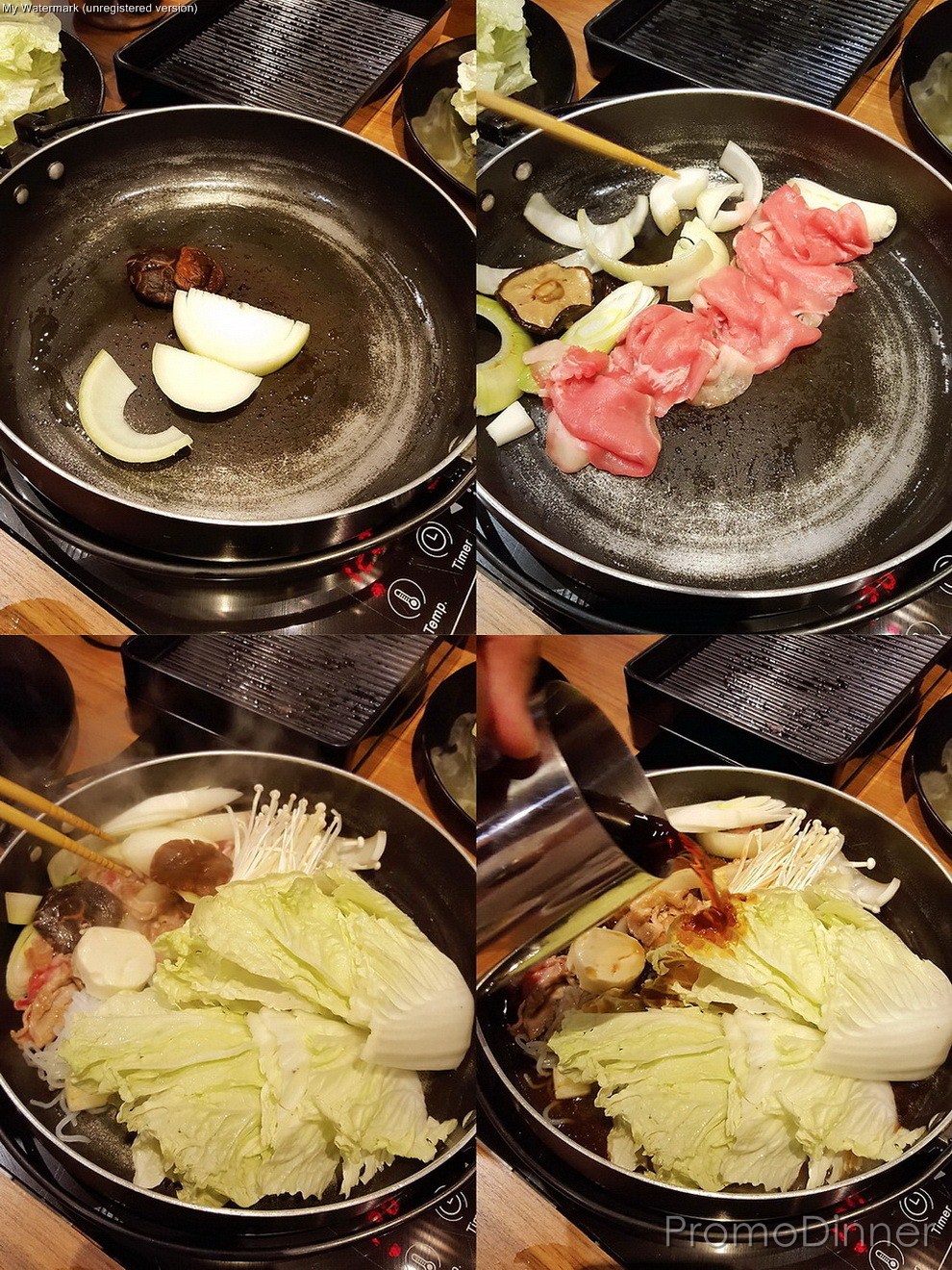 เริ่มที่สุกี้ก่อน ผมวานให้น้องเค้าทำให้เลยครับ เริ่มจากเค้าจะเอาพวกเห็ด หอมใหญ่ ลงไปผัดในกระทะให้เกิดกลิ่นก่อน จากนั่นจะใส่เนื้อสัตว์ลงไปผัด เติมผักต่างๆลงไปผัดอีกครั้ง และถึงจะเริ่มเทน้ำสุกี้ลงไปครับ ซึ่งการที่นำวัตถุดิบลงไปผัดก่อนที่จะเติมน้ำ มันจะทำให้น้ำสุกี้หอมครับ