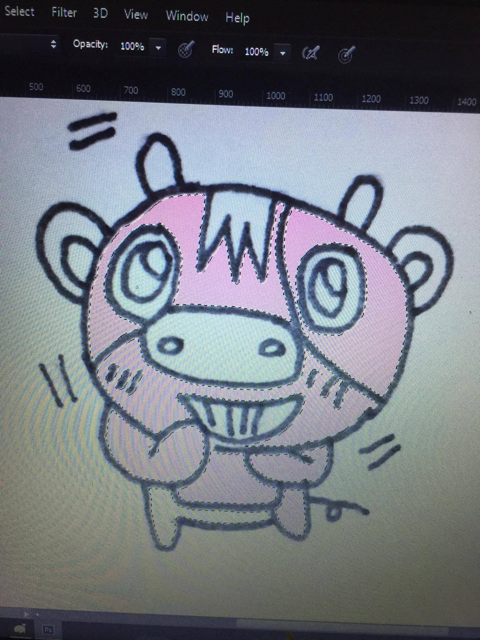คลิกสร้างเลเยอร์ใหม่ ตัวชื่อว่าส่วนเลือก ในที่นี้ตั้งว่า "ตัว'' นำเมาส์ไปคลิกเลือก magic wand คลิกส่วนที่ต้องการลงสี ผมได้คลิกเลือกในส่วนใบหน้าและลำตัวทั้งหมด และทำการไล่สีโดย ทำการลงสีอ่อน (pastel) ไปก่อน คือ สีชมพูอ่อน