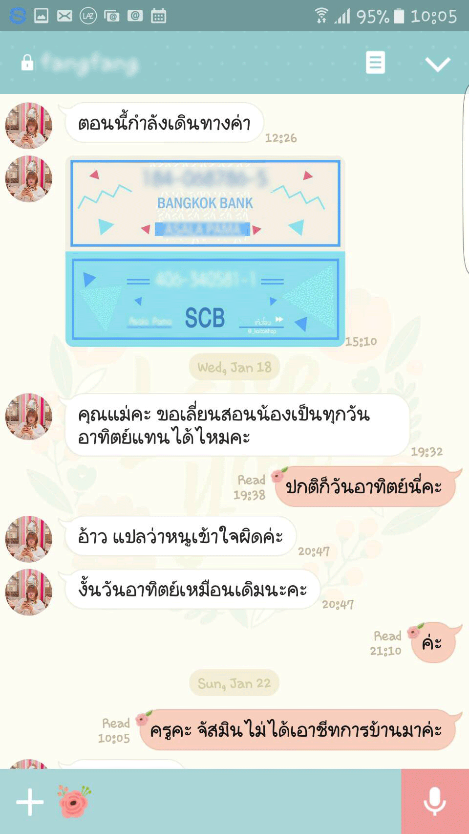 หลังจากนั้นครูแจ้งว่าไม่สะดวกเข้ามาสอนในวันอาทิตย์ 13:00แล้วจะขอสอนทางOnline แทน ซึ่งทางผมมองว่าลูกสาวยังเด็กการเรียนทาง Online น่าจะไม่เหมาะจึงบอกกับครูว่า ถ้าไม่สามารถเข้ามาสอนได้ตามที่ตกลงกันก็ขอให้โอนเงินคืนส่วนที่ยังไม่ได้เรียน จากนั้นครูก็ไม่อ่านแชทไม่ตอบข้อความ โทรไปก็ไม่รับ 4-5วันถึงจะแชทตอบมาประโยคนึงอ้างว่างานยุ่งมากไม่มีเวลาอ่าน Line เลย ทางผมก็ยืนยันให้โอนเงินคืน ครูก็จะอ่านLineและกลับมาตอบแชทแบบ 2-3 วันหนึ่งประโยคพร้อมบอกว่างานยุ่ง