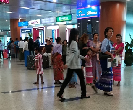 เสร็จภารกิจทุกอย่างที่สนามบินทั้งสองภารกิจจะอยู่ในสนามบินตรงทางออก หาง่ายเพียงแค่เดินออกมาก็เจอ ผู้คนพม่าจะมีความเป็นอัตลักษณ์อีกอย่างคือ การนุ่งผ้าถุง และผ้าโสร่งในการดำรงชีวิตปกติไม่ว่าจะไปเที่ยว เรียน หรือทำงาน พร้อมกับการหนีบรองเท้าแตะหรือรองเท้าช้างดาวไปตามสถานที่ต่างๆ