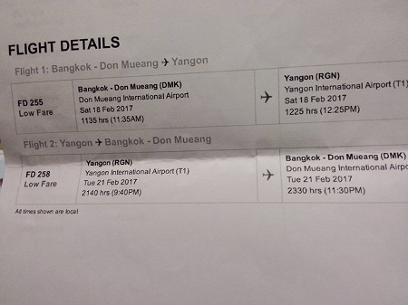 ใช้เวลาอยู่บนเครื่องประมาณ 1 ชั่วโมง 30 นาที ก็ถึงจุดหมายคือ สนามบินย่างกุ้ง (Yangon) เวลาประเทศพม่าช้ากว่าประเทศไทย 30 นาที เมื่อไปถึงสนามบินย่างกุ้ง การไปเที่ยวกลุ่มประเทศ AEC สมัยนี้สบายเพราะไม่ต้องมีวีซ่า และตำรวจตรวจคนเข้าเมืองที่นั้นไม่ถามอะไรมาก อุตส่าห์เตรียมประโยคคำตอบง่ายๆ ไปเผื่อถามแล้วว่า “ไอ แอม ซิงเกิล” (ฉันเป็นคนโสด) เกี่ยวกันไหม??? ไม่รู้หละว่าถามอะไรมา แต่จะตอบยั้งงี้ 5555