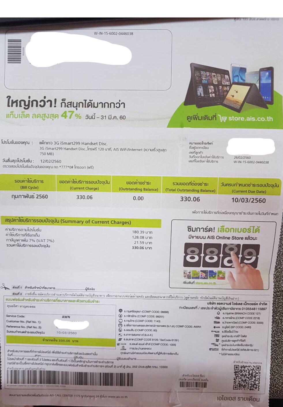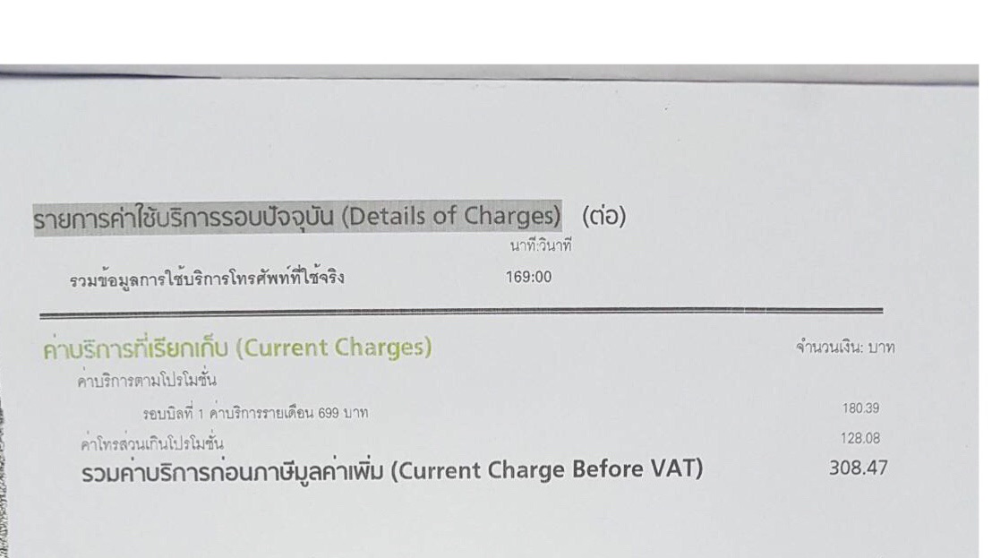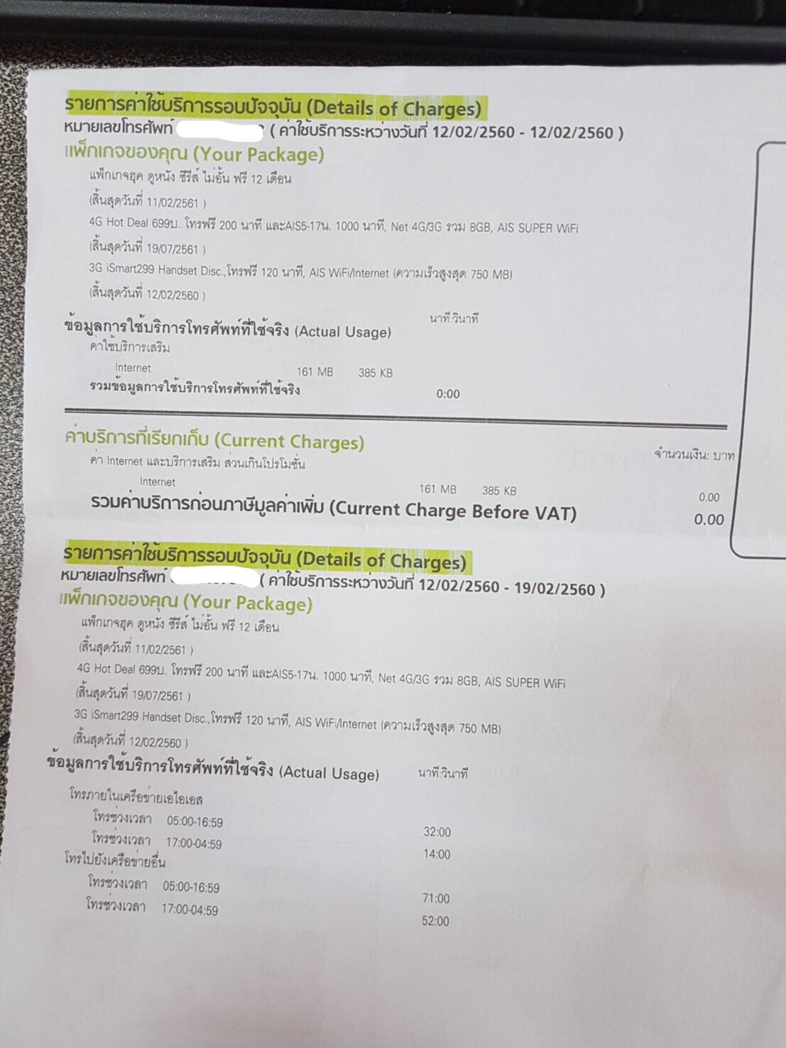 ส่วนบิลนี้เรียกเก็บตามโปร 699 ที่เราเลือกไว้ แต่มันตัดรอบบิล วันที่ 19 ก.พ.60 เราซื้อ 12 ตัดบิล 19 แต่พนักงานขายที่งาน Mobile Expo บอกตัด 12 เดือนหน้า สรุป ให้เราเฉลี่ยในโปร โทรได้แค่ 52 นาที จากวันที่ 12-19 ก.พ. แล้วส่วนที่เกินละ นาทีละ 1.50 บาท เกินไปเกือบ 100 นาที