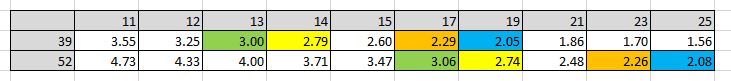 อันนี้เทียบจากรถตัวเองเฟือง 11-25 ใช้กับจานหน้า 52-39 ซึ่งจะมีอัตราทดที่ใกล้เคียงกันหรือซ้ำๆกันอยู่ประมาณ 4 คู่ ตามตารางนี้อ่ะครับ