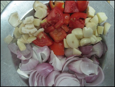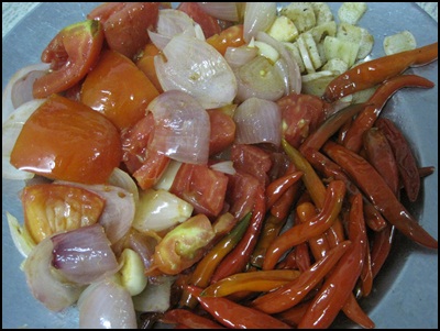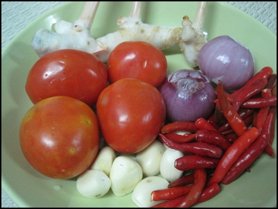 1.มาเตรียมส่วนประกอบน้ำพริกกัน มี มะเขือเทศ หอมเเขก ข่า กระเทียม เเละพริกแดง