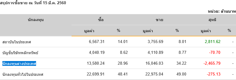 Sinthorn Summary 15/3/2560 : ต่างชาติขายสุทธิ -2,465.79 ลบ.