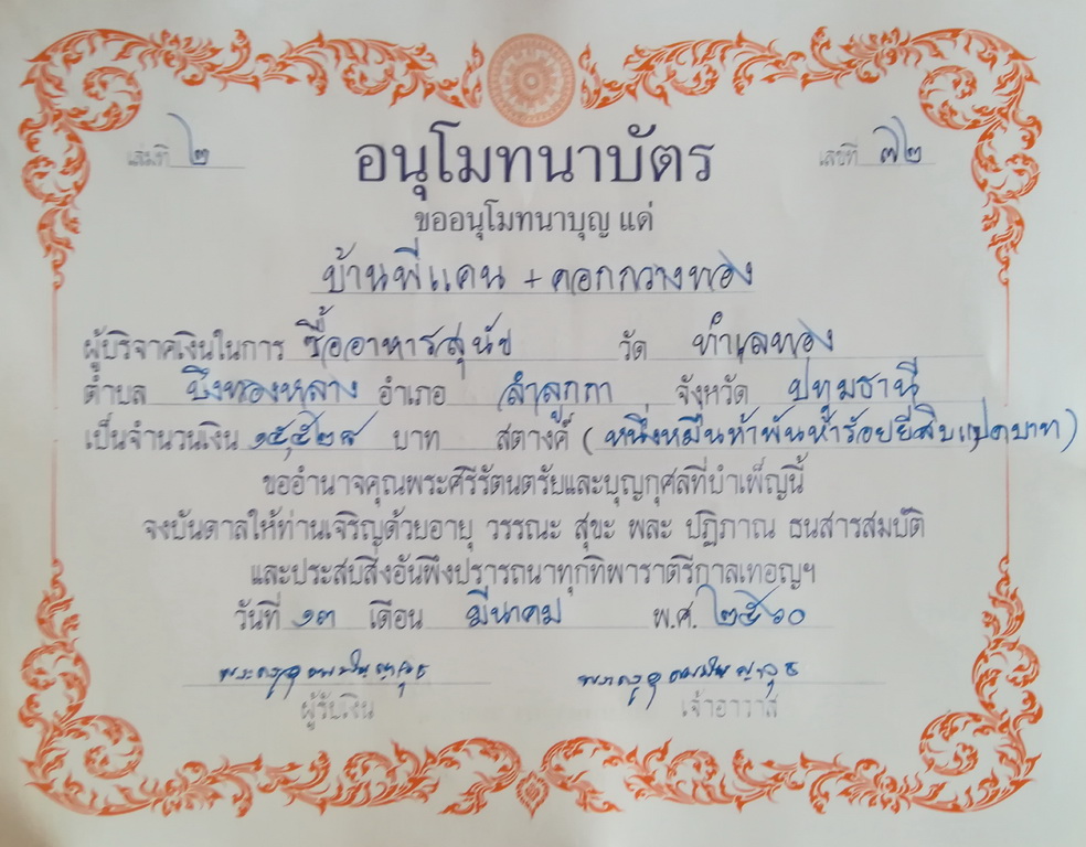 วันจันทร์ที่ 13 มีนาคม 2560 วันดี ฤกษ์ดี นำเงินไปซื้ออาหารเม็ด และนำเงินสดมอบให้ท่านเจ้าอาวาส ตามวัตถุประสงค์