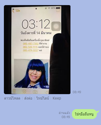น้อง : เค้าถามว่าใช่เจ้าของไอโฟนที่หาไหม เดี๋ยวหนูส่งเบอร์ให้ในแชทนะ