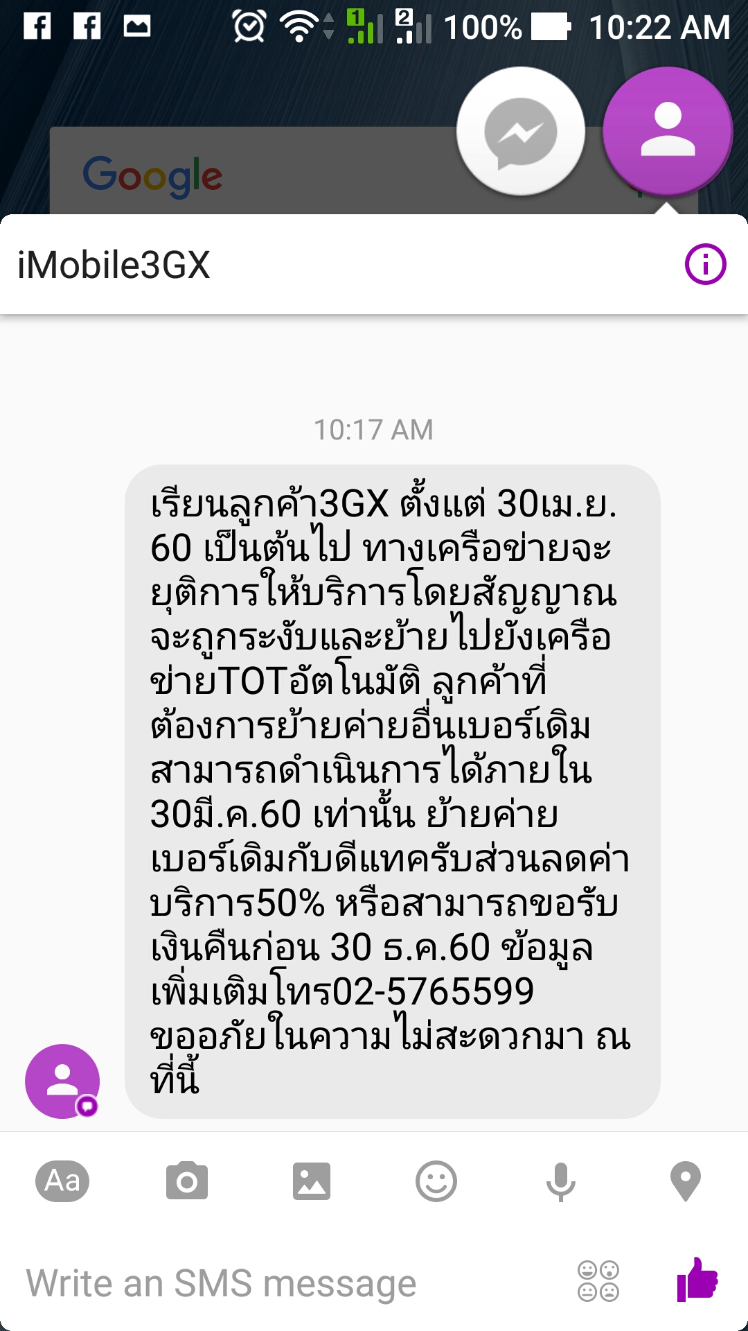 ตอนนี้ใช้ซิม imobile 3GX อยู่ เช้านี้เปิดเครื่องมาได้รับ SMS แจ้งว่า ทาง 3GX จะหยุดให้บริการตั้งแต่วันที่ 30 เมษายน เป็นต้นไป โดยสัญญาณจะถูกระงับและย้ายไปยังเครือข่าย TOT อัตโมัติ.. ทีนี้มีข้อสงสัยว