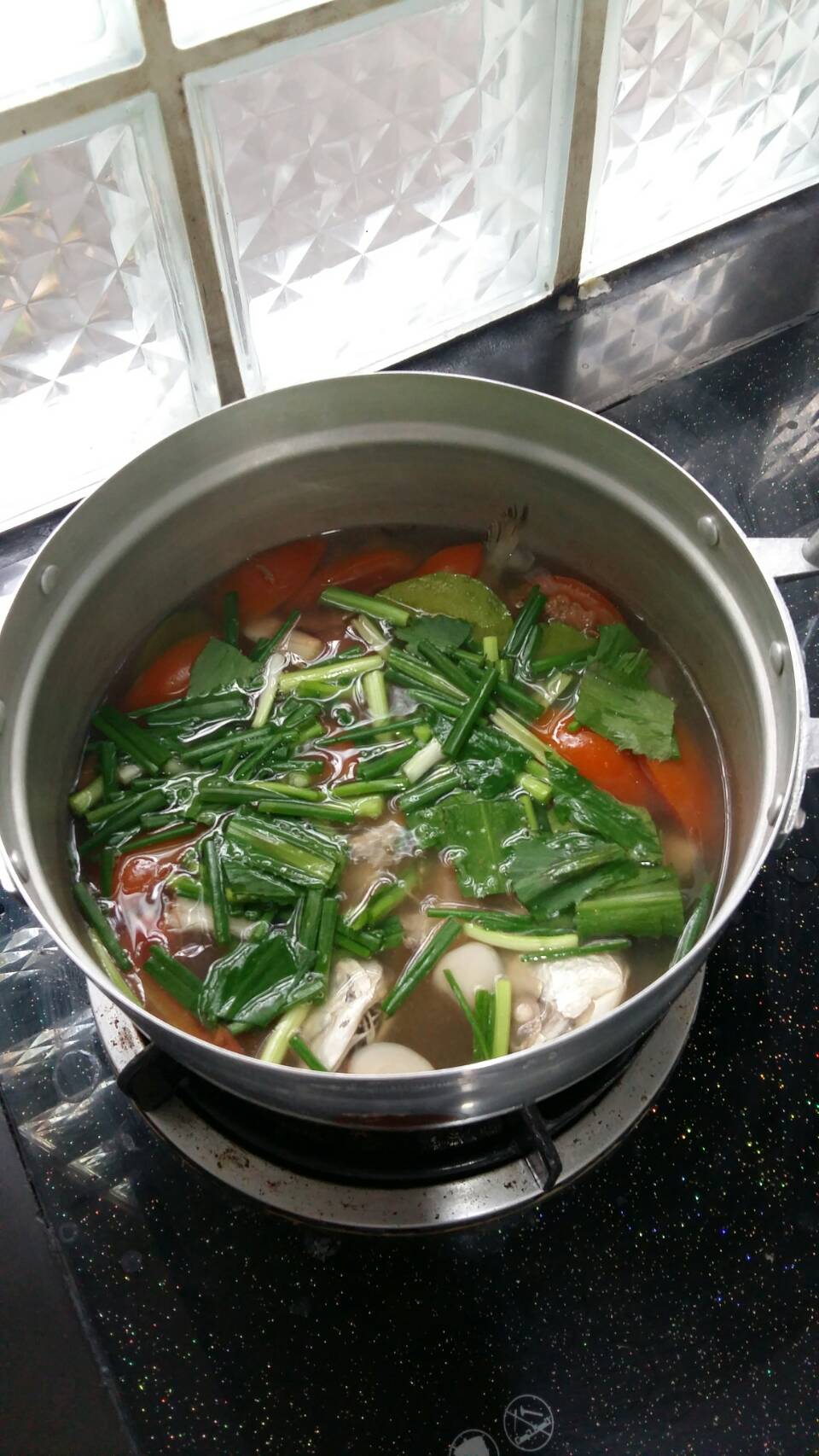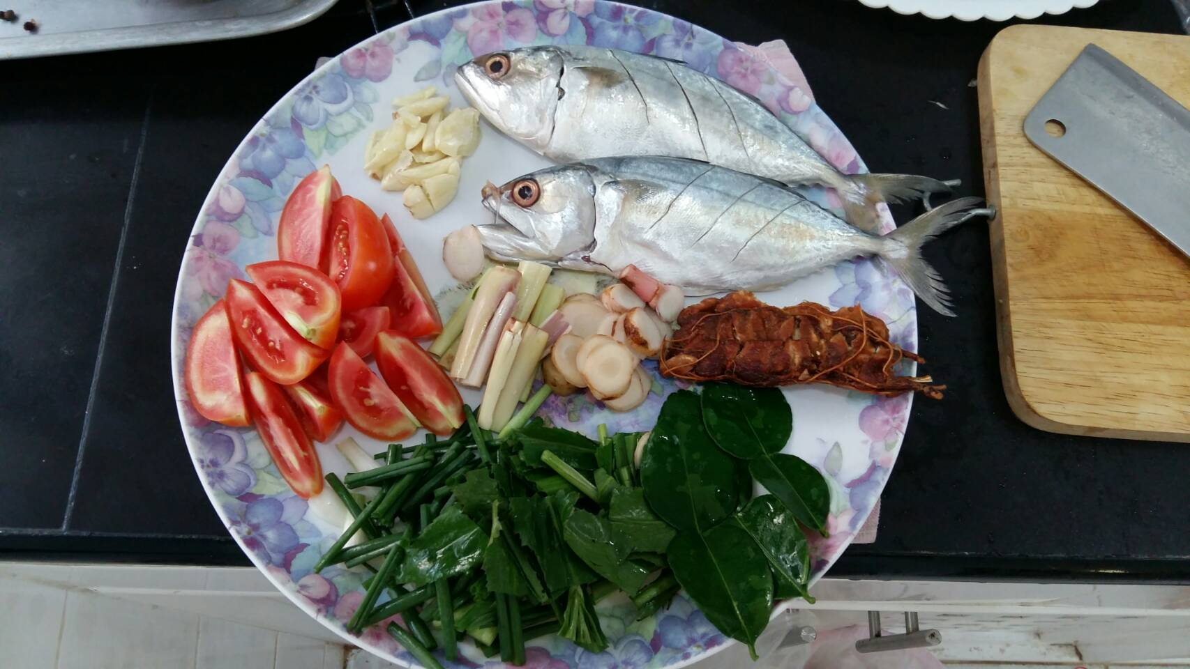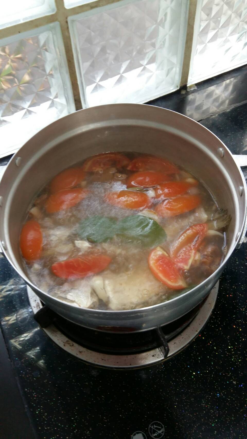 ขั้นตอนแรก ต้มน้ำให้เดือด พร้อมใส่กระเทียมที่ทุบไว้ลงไปด้วย ใส่เกลือลงไปพอมีรสชาติของความเค็ม ใส่ข่า,ตะไคร้ ใบมะกรูด มะขามเปียก ที่เตรียมไว้ พอเดือดสักพักใส่น้องปลาทูจ๋าลงไป