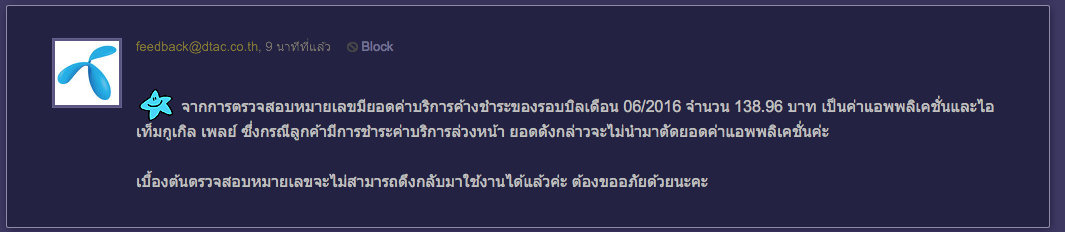 จึงสอบถามเหตุผล คำตอบคือ ก่อนมาผมติดค่าบริการที่ซื้อจาก Google Play จำนวน 138.96 ซึ่งเงินที่จ่ายไปล่วงหน้าจะไม่ถูกหักไปจ่ายค่าใช้จ่ายในส่วนนี้ แล้วทำไมตอนผมไปเคลียร์ค่าใช้จ่ายกับ DTAC เจ้าหน้าที่ไม่ให้ผมจ่ายให้หมด??