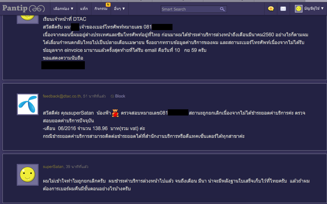 ปล.ผมก็ไม่ได้กล่าวโทษทาง DTAC ฝ่ายเดียวนะครับผมก็ผิดที่ไม่ได้ตรวจสอบ einvoice ให้ดี (คิดว่าไม่มีปัญหา) ตอนนี้เริ่มทำใจเรื่องเบอร์ได้แล้วครับและได้ติดต่อครอบครัวที่ไทยให้ช่วยจ่ายค่าบริการที่ค้างไว้