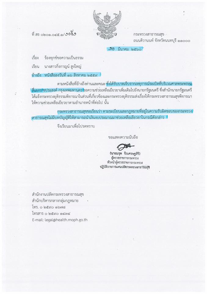 ล่าสุดผู้ใช้เฟสบุ๊กดังกล่าว โพสต์หนังสือตอบกลับส่งมาจากกระทรวงสาธารณสุข ลงวันที่ 10 มีนาคม 2560 ว่า จากกรณีการขอความช่วยเหลือดังกล่าว กระทรวงสาธารณสุข ขอเรียนว่า ตามระเบียบและกฎหมายที่อยู่ในความรับผิดชอบของกระทรวง ไม่มีบทบัญญัติให้สามารถนำงบประมาณมาช่วยเหลือเยียวยาในกรณีดังกล่าว