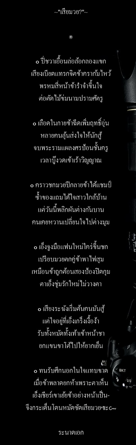 . . O เมื่อแสงเรื่อรองงามแห่งยามรุ่ง ค่อยค่อยฟุ้งฟายอณูเพรียกตรู่สาง คลี่ปลายปีกปักษินล้อมถิ่นทาง โลกเบื้องล่างก็ค่อยฟื้นขึ้นตื่นตัว O ดอกดวงมวลน้ำค้าง .. หยาด-