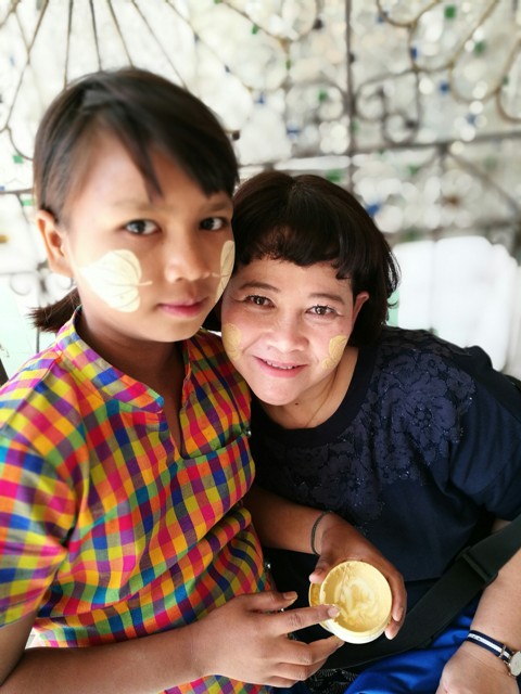 ที่นี่ได้พบรักอีกครั้งกับน้อง make up artist ที่พี่มิวไปตามหารอบวัด โดยปกติจะมีเด็กๆหลายคน คอยวาดรูปใบไม้ด้วยทาคานาบนแก้มนักท่องเที่ยว แต่วันนี้ไม่มีเลย เห็นเด็กผู้หญิงคนนึงกำลังยืนล้างจานพี่มิวเลยไปถาม น้องบอกว่าเด็กๆไปโรงเรียน และอีกอย่างทางวัดไม่อยากให้มาวุ่นวายเหมือนกับรบกวนนักท่องเที่ยว แต่บอกให้เดินไปประตูอีกทางของวัด ซึ่งเป็นแผงขายของที่ระลึก แล้วน้องก็หยิบกระเป๋าออกมา มีกระปุกทานาคาสำเร็จรูป และไม้หนึ่งชิ้น เราผลัดกันนั่งให้น้องบรรจงวาดใบไม้ทีละคน ในระหว่างที่น้องทำ ความตั้งใจมุ่งมั่นในใบหน้าอันเรียบเฉยของน้อง อยากให้น้องยิ้ม มีความสุข และภูมิใจในสิ่งที่น้องทำ ป้าควักเงินให้ 3000 จ๊าด น้องมองหน้าแต่ไม่หยิบเงินไปจากมือและมองหน้าพี่มิว คิดว่ามันมากเกินไปสำหรับน้อง เลยบอกพี่มิวให้บอกน้องว่า ป้าๆให้เป็นกำลังใจ แล้วนางก็รับไปด้วยความดีใจ มีรอยยิ้มในดวงตากลมๆของน้อง ป้าก็ชื่นใจ มิตรภาพไม่มีลิมิต ชีวิตเกินร้อย..ไม่ใช่โฆษณาแฝงนะคะ