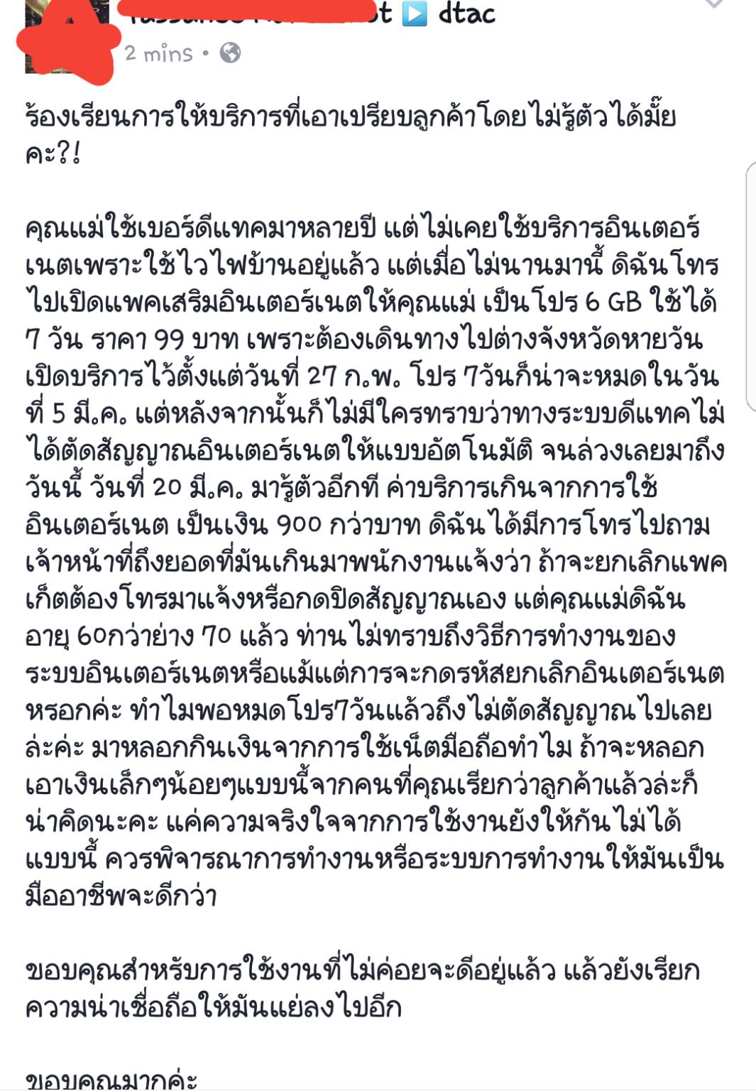 สุดท้าย อยากให้ดีแทคมีคำตอบที่ดีกว่านี้กับเราหน่อย ลูกค้าทุกคนไม่ได้เข้าใจระบบการเปิดปิดอินเตอร์เนต การกดรหัสโทรออกอะไรกันทุกคนหรอกค่ะ โปรมันบอก7วันก็ควรจะแค่ 7 วัน ใช้เนตไม่ถึงกำหนดก็ตัดๆมันไปเถอะค่ะ ไม่ต้องใจดีให้ใช้แล้วหลอกเก็บเงินค่าบริการเค้าแบบนี้หรอก ลูกค้าจะหายไปหมดเพราะการบริการที่ไม่พัฒนาแบบนี้ล่ะค่ะ