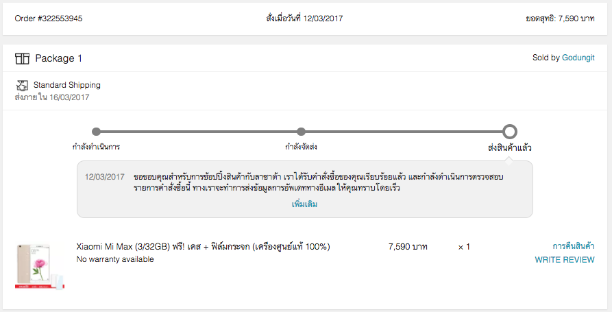 ผมสั่งซื้อสินค้ากับ Lazada เป็น Xiaomi Mi Max (3/32GB) ฟรี! เคส + ฟิล์มกระจก (เครื่องศูนย์แท้ 100%) กำหนดส่งของ 14-16 มีนาคม 2660