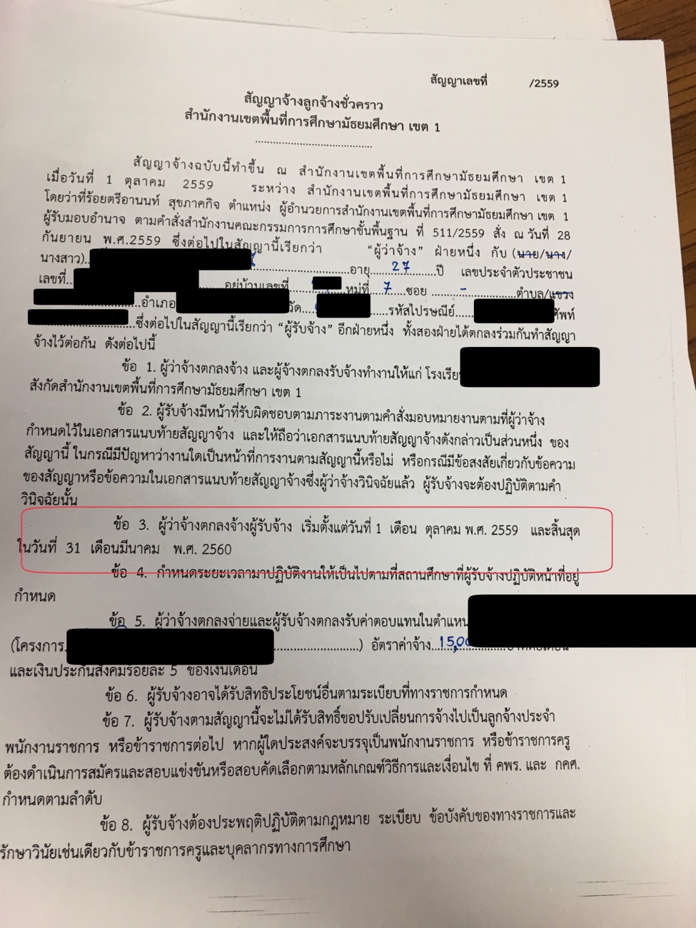 ผมทำงานเป็นลูกจ้างชั่วคราว ตำแหน่งเจ้าหน้าที่ธุรการ ในสถานศึกษาของรัฐ ทำมาได้เกือบปีแล้วครับ (เริ่มงานตั้งแต่22พ.ค.57) สัญญาจ้างงานของผม6เดือนต่อครั้งนึง ล่าสุดต่อสัญญาวันที่1ตุลาคม57 ซึ่งสัญญามีผลตั้