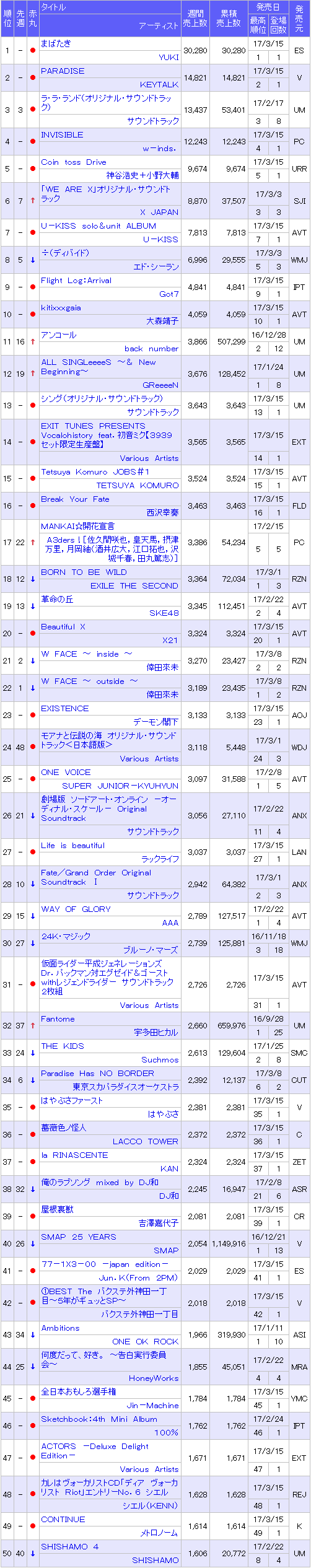 ศิลปินหญิง YUKI (45) อดีตนักร้องนำวง JUDY AND MARY จากสังกัดค่าย EPIC Records ในเครือของ Sony Music Japan วางขายอัลบั้มเดี่ยวใหม่ในรอบ 3 ปีอัลบั้มชุดที่ 8 กับ 『Mabataki (まばたき)』(วางขายวันที่ 15 มีนาคมที่ผ่านมา) ขายไปได้ 30,280 แผ่น ขึ้นสู่อันดับ 1 ของโอริคอนชาร์ทอัลบั้มรายสัปดาห์ เป็นอัลบั้มอันดับหนึ่งครั้งที่ 6 และครั้งแรกในรอบ 5 ปี 7 เดือน หลังจากอัลบั้มที่ 6 『megaphonic』(วางขายเมื่อ 24 สิงหาคม 2011)