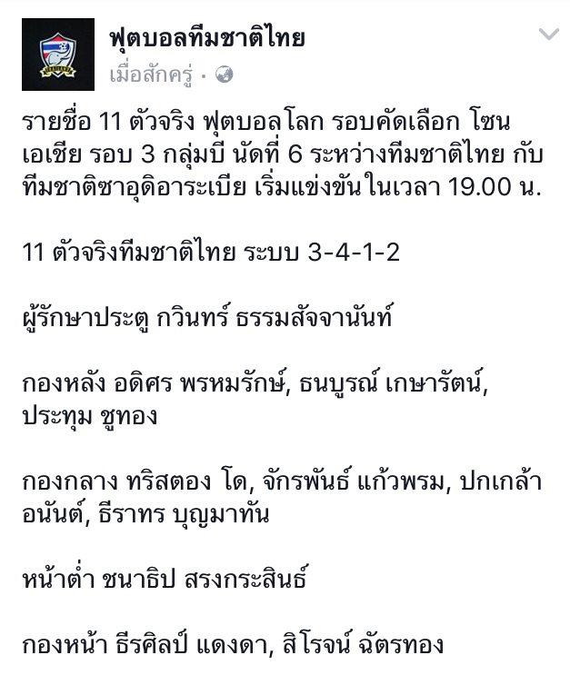 รายชื่อ 11 ตัวจริง ไทย - ซาอุ