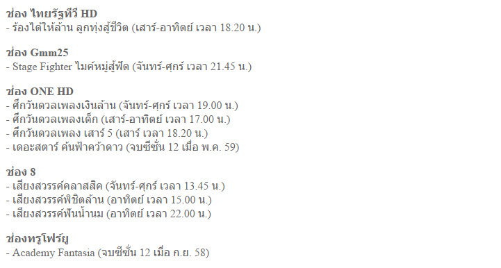 ทำไมทีวีบ้านเรา มีแต่รายการประกวดร้องเพลงเยอะจังคะ คือช่องใหญ่ ช่องเล็ก ดิจิตอล เปิดไปข่องไหนก็เจอ วันหยุดได้อยู่บ้านมาสองเสาร์อาทิตย์ เปิดไงก็ไม่พ้นรายการประเภทนี้เลย ยุคก่อน มีรายการประกวดร้องเพลง