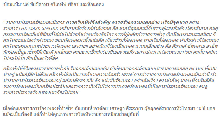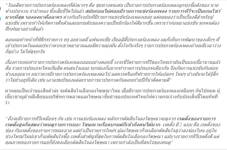 เอาความสามารถของผู้เข้าประกวด เอาความฉลาดพูด ฉลาดถาม ของงกรรมการ มาโชว์ไม่ดีกว่าเหรอ ยกตัวอย่าง เวิร์ค พอยท์ ใส่มันมาหมดไม่ว่ารายการอะไร จนล้น ลามไปช่อง 3 ลาบันด้า ของมันดี ๆ อยู่แล้วใส่ดราม่ามาทำไม
