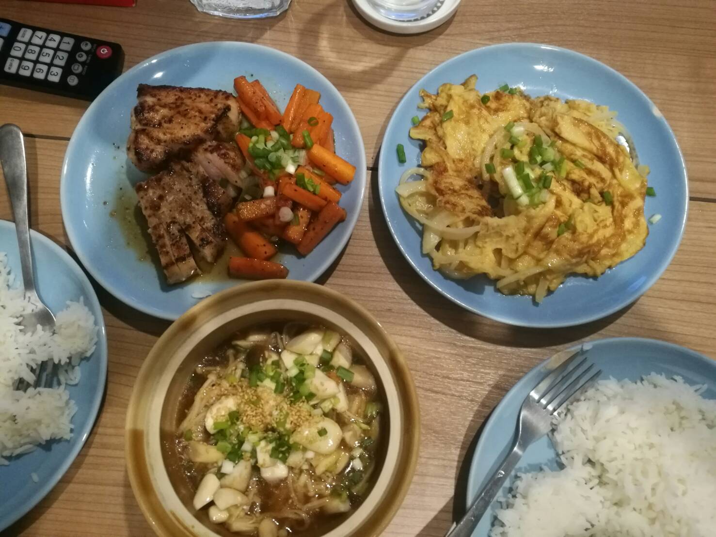 อันนี้รวมมิตรมื้อเย็น สันนอกหมูย่างกะทิ ไข่เจียว เห็ดเข็มทอง+ออรินจิผัดน้ำมันหอย