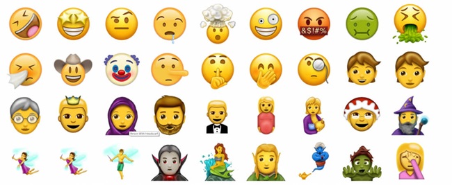 อีโมจิในปีนี้เป็นแบบครอบคลุม เช่น การเลี้ยงลูกด้วยนมแม่ และการสวมผ้าคลุมศีรษะ ผู้สูงอายุและคนที่มีเครา นอกจากนี้ยังมีชุดอีโมจิที่เหมาะสำหรับให้คนรู้ว่าพวกเขากำลังพูดถึงเรื่องไม่สุภาพ เช่น ใบหน้าที่มีนิ้วบังปาก, หน้าที่มีคิ้วยกขึ้น และมือปิดขณะหัวเราะ หรือในโอกาสที่รุนแรงก็ยังมีการแสดงความโกรธ และการอาเจียน