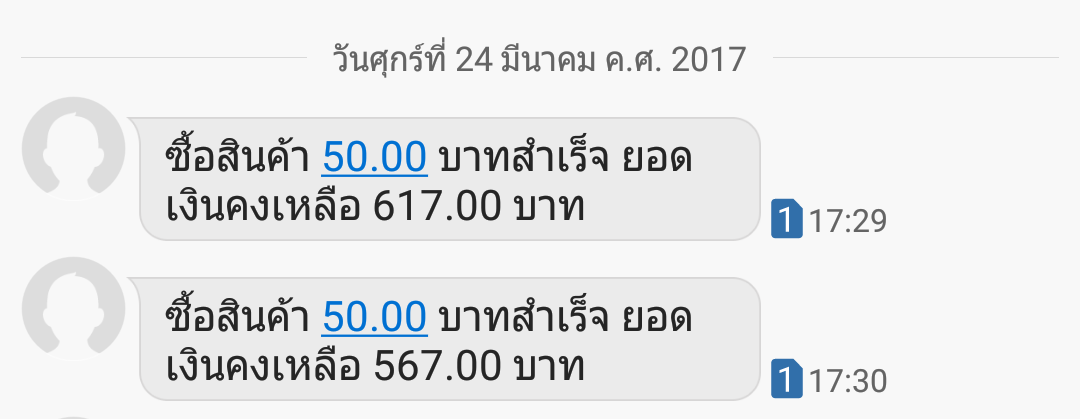 พอช่วงเย็นๆมา มี Sms แจ้งมา ว่าชำระสินค้าไป 50฿ 2 ครั้งตามรูปค่ะ ทั้งๆที่ใน line pay ขึ้นว่ายกเลิกแล้ว แต่กลับยังโดนหักไป 50 ทั้งสองครั้งคือ และเงินก็ไม่เข้าค่ะ